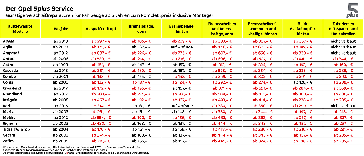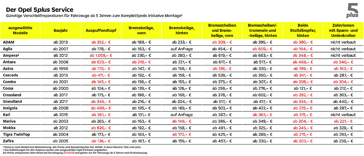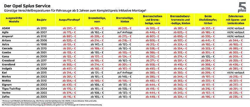 Verschleißreparaturen für Opel ab 5 Jahren nach Erstzulassung zu sensationellen Komplettpreisen.